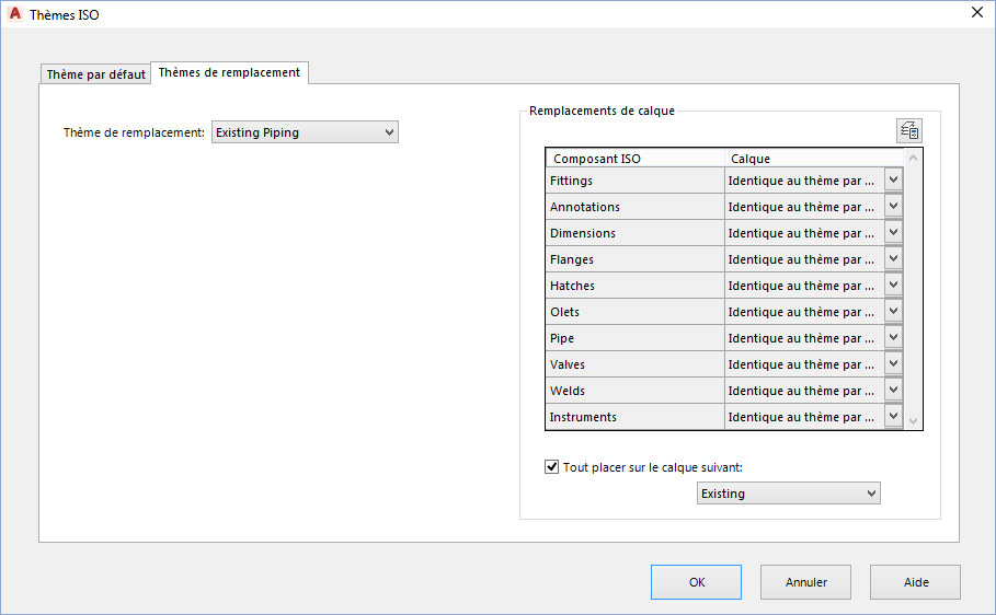 Indique le calque sur lequel apparaît chaque composant Iso. Par défaut, tous les calques sont définis sur Identique au thème par défaut. La liste des composants comprend les raccords, brides, hachures, isolations, instruments, tuyaux, olets et vannes. Les composants globaux tels que les tables sont exclus.