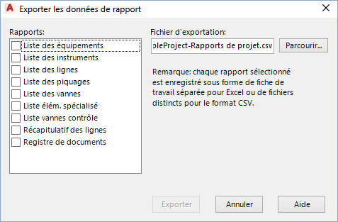 Le bouton Exporter ne s'active que lorsque vous sélectionnez un ou plusieurs types de rapport et avez spécifié un fichier d'exportation.