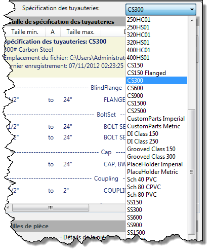 Dans la liste déroulante, cliquez sur une spécification des tuyauteries (p. ex. CS300).