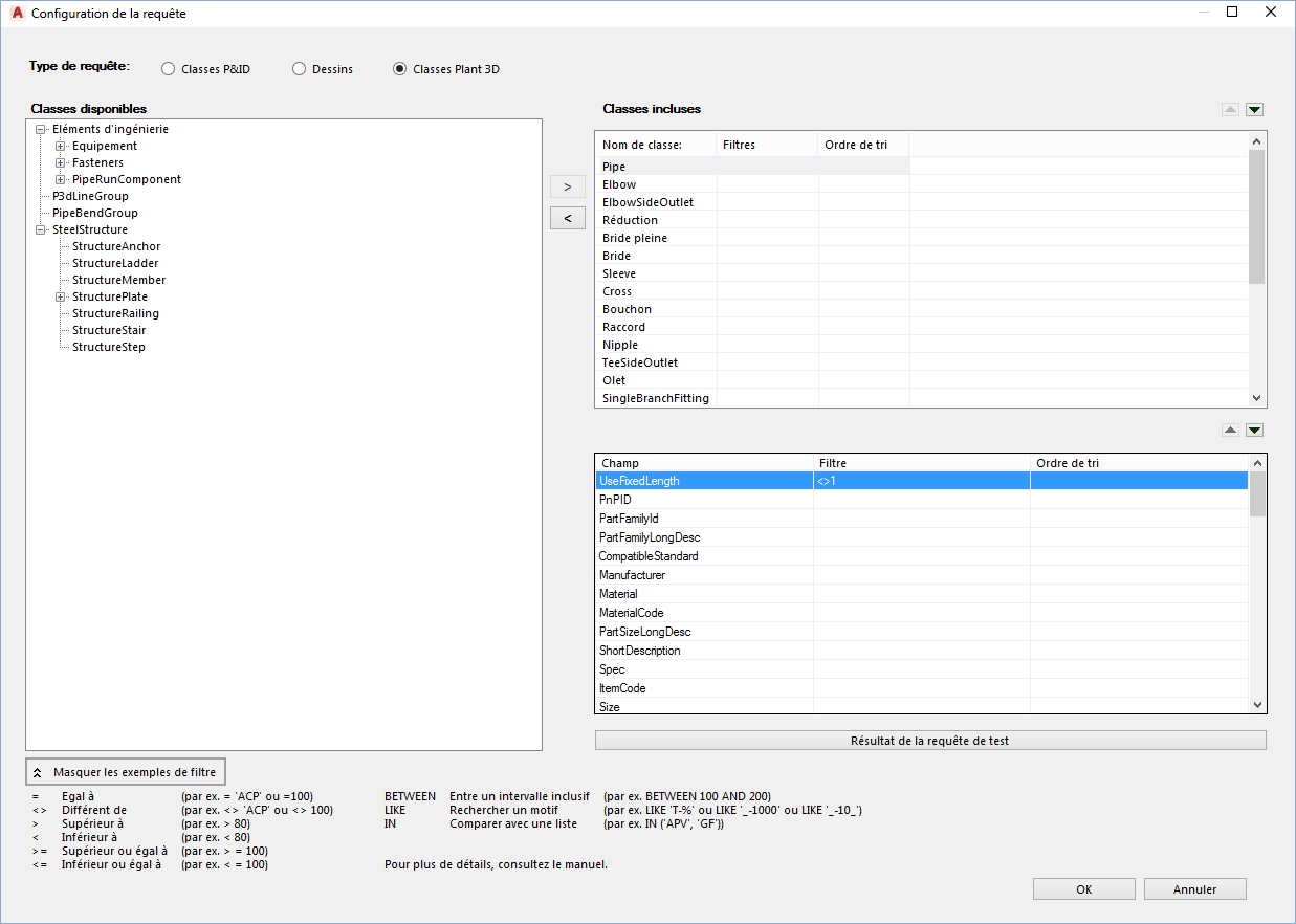 - Dans le champ Type de requête, cliquez sur Classes P&ID, Dessins ou Classes Plant 3D.