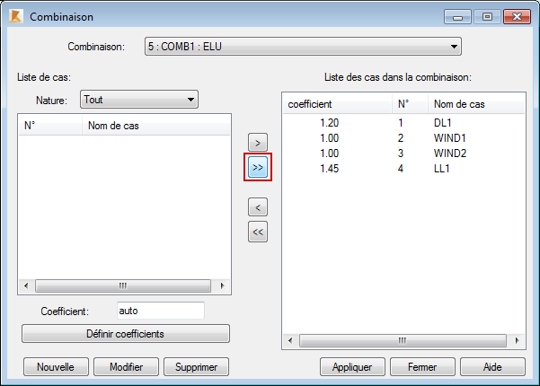8. Dans la boîte de dialogue Combinaisons, cliquez sur pour transférer tous les cas de charge définis du groupe de fonctions gauche vers la liste des cas de charges appartenant à la combinaison dans le groupe de fonctions droit.