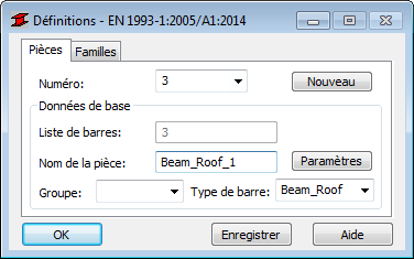 - Dans la boîte de dialogue Définitions, définissez le numéro sur 3. Le type de barre est déjà défini sur Beam_Roof. Vérifiez que le nom de la pièce est Beam_Roof_1 et cliquez sur Enregistrer.