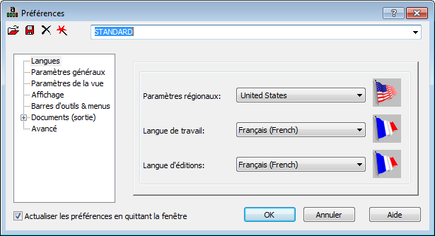 Remarque : Les paramètres régionaux définissent les bases de données par défaut (pour les profilés et matériaux), ainsi que les unités et les normes nationales en vigueur dans un pays.
