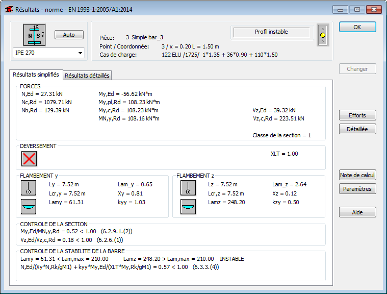 . La boîte de dialogue Résultats s'affiche, indiquant que la barre présente des problèmes d'instabilité, comme illustré ci-dessous.