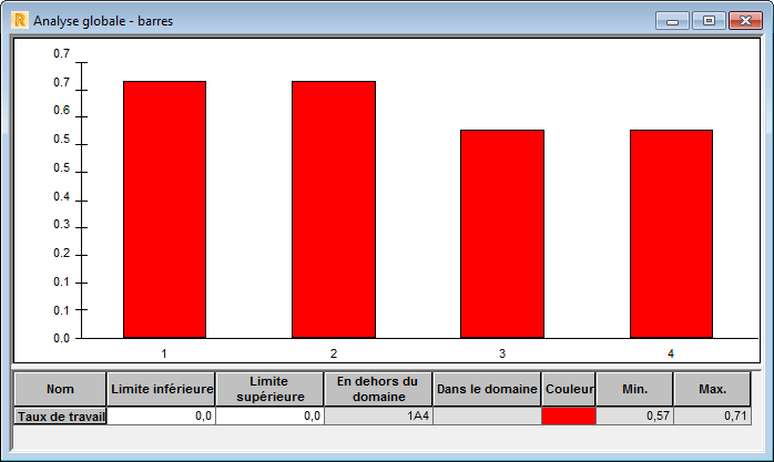 - Dans la zone Taux de travail, cliquez sur Analyse pour ouvrir la boîte de dialogue Analyse globale - barres pour réviser la présentation graphique du taux de travail pour les barres vérifiées.