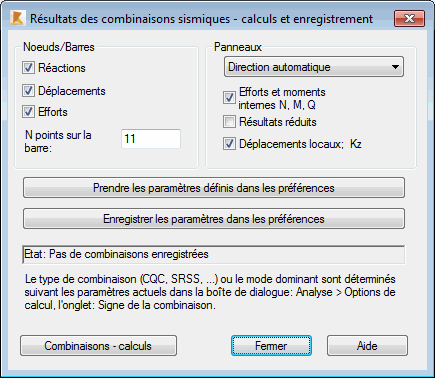 Dans les zones Nœuds /Barres et Panneaux, sélectionnez les types de résultats qui seront calculés pour les combinaisons de l’analyse sismique.