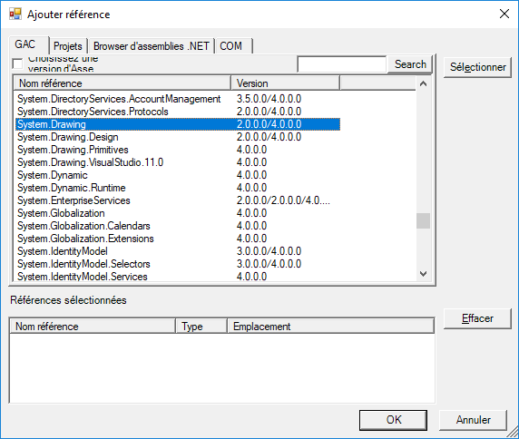 Dans la liste de la boîte de dialogue Ajouter une référence, recherchez et sélectionnez System.Drawing et System.Windows.Forms. Maintenez la touche Ctrl enfoncée pour sélectionner plusieurs éléments. Exemple :