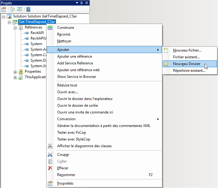 Retournez dans l'environnement IDE Revit. Dans l'explorateur de projets (pour continuer cet exemple) cliquez avec le bouton droit de la souris sur le dossier que vous avez créé pour votre macro, puis choisissez Ajouter