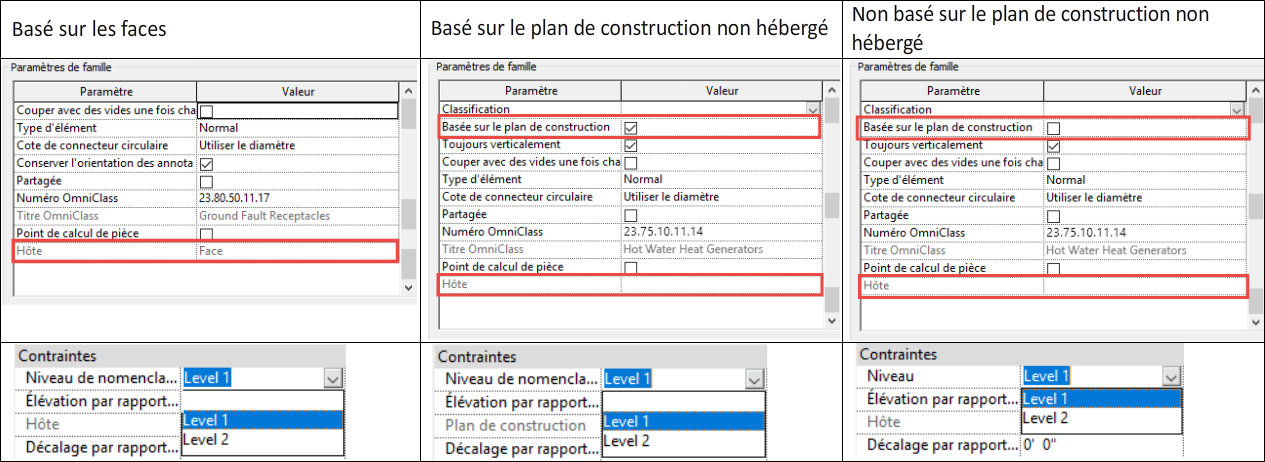 La définition de contenu a également un impact sur la propriété de niveau disponible. Une valeur de propriété de niveau de nomenclature existe pour les éléments basés sur les faces et le plan de construction, hébergés et non hébergés. Les éléments non hébergés et non basés sur le plan de construction n'ont pas de propriété de niveau de nomenclature, mais une propriété de niveau, comme décrit dans le tableau suivant :