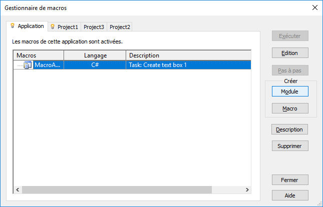 - Sélectionnez l'onglet Application (pour les macros au niveau de l'application) ou un onglet Projet (pour des macros au niveau du document).
