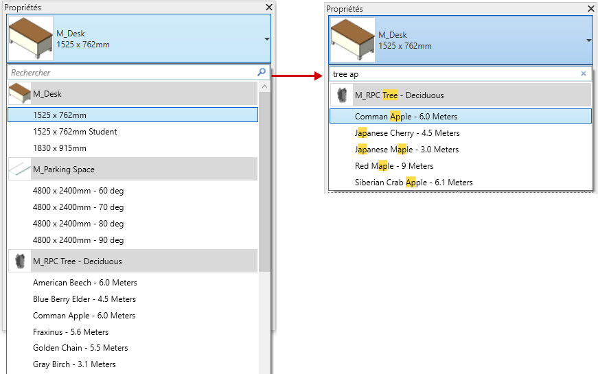 Revit pour faciliter la sélection à partir d'une longue liste d'options. Vous pouvez effectuer une recherche dans les zones fonctionnelles suivantes :