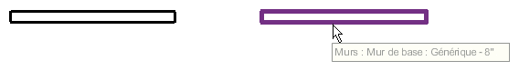 Une fonction Revit de mise en surbrillance automatique facilite l'identification et la sélection des éléments. Lorsque vous déplacez le pointeur sur ou à proximité d'un élément de la zone de dessin, le contour de l'élément est mis en surbrillance et son trait s'épaissit. Une description de l'élément s'affiche dans la barre d'état située dans la partie inférieure de la fenêtre Revit. Si vous maintenez quelques instants le pointeur sur l'élément, sa description s'affiche également dans une info-bulle sous le pointeur.