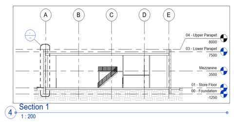 11. Zoom in to the section mark for the 01 - Store Floor and South Elevation floor plan view on the sheet. Notice that the section mark is updated to indicate that the Building Section view is the fourth view placed on the A1 sheet.