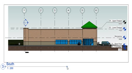 4. Using the same method, drag the South Elevation floor plan view below the 01 - Store Floor view, moving the view slightly to the right until the centers align, then click to place the view.