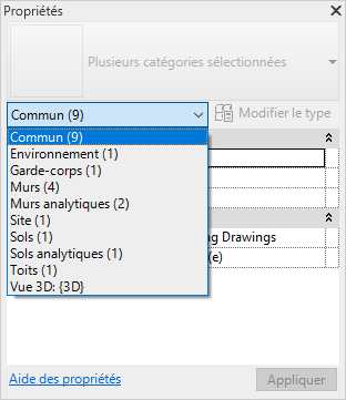 Sous le sélecteur de type, un filtre identifie la catégorie des éléments allant être placés par un outil ou la catégorie et le nombre d'éléments sélectionnés dans la zone de dessin. Si plusieurs catégories ou types sont sélectionné(e)s, seules les propriétés d'occurrence communes à tous s'affichent dans la palette. Lorsque plusieurs catégories sont sélectionnées, utilisez la liste déroulante du filtre pour afficher uniquement les propriétés d'une catégorie ou de la vue. La sélection d'une catégorie spécifique n'a pas d'incidence sur l'ensemble du jeu de sélections.