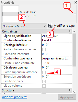 Dans la plupart des cas (voir les exceptions dans la remarque ci-dessous), la palette Propriétés affiche les propriétés d'occurrence en lecture seule (grisées) et celles modifiables par l'utilisateur. Une propriété peut être en lecture seule lorsque sa valeur est calculée ou affectée automatiquement par le logiciel ou lorsqu'elle dépend du paramètre d'une autre propriété. Par exemple, la propriété Hauteur non contrainte d'un mur n'est modifiable que si la valeur de la propriété Contrainte supérieure est définie sur Sans contrainte. Pour connaître des dépendances particulières, voir les descriptions des propriétés d'occurrence pour les différents types d'éléments.