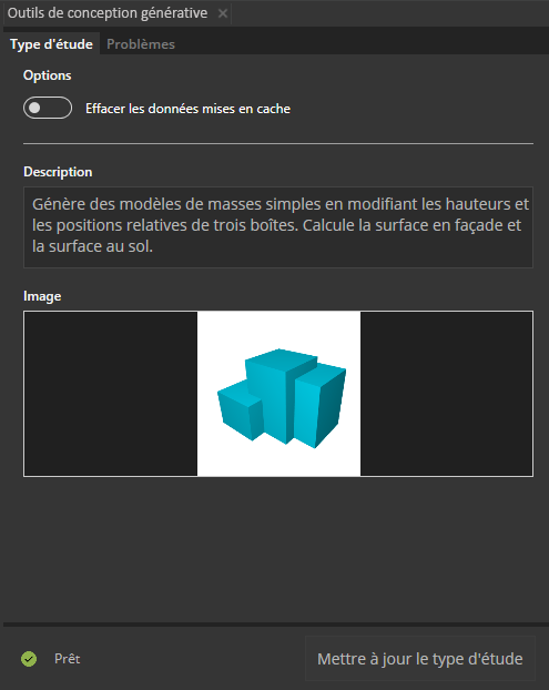 - Les outils de Conception générative s'affichent dans le volet droit de la fenêtre Dynamo. Cliquez sur l'onglet Type d'étude pour créer ou mettre à jour le type d'étude pour le graphique actuel, y compris le dossier Dépendances associé. Cliquez sur l'onglet Problèmes pour afficher et résoudre les problèmes rencontrés dans le graphique.