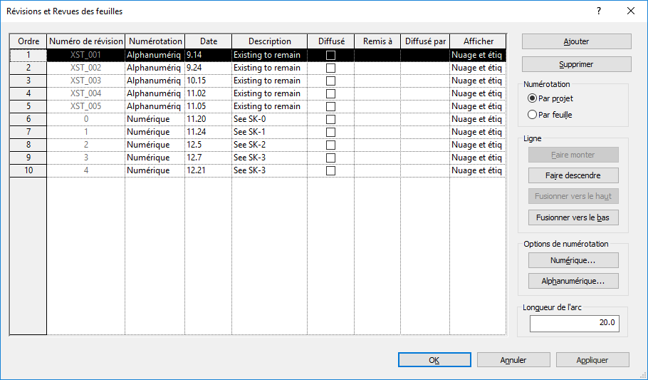 Lorsque l'option Numérotation est définie sur Par projet, une nouvelle colonne Numéro de révision affiche le numéro de révision qui sera créé en fonction de l'ordre, du schéma de numérotation et des options de numérotation. Lorsque Numérotation est définie sur Par feuille, la colonne Numéro de révision ne s'affiche pas, car elle n'est pas applicable.