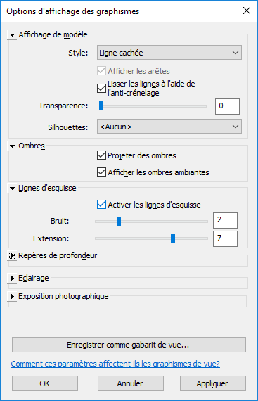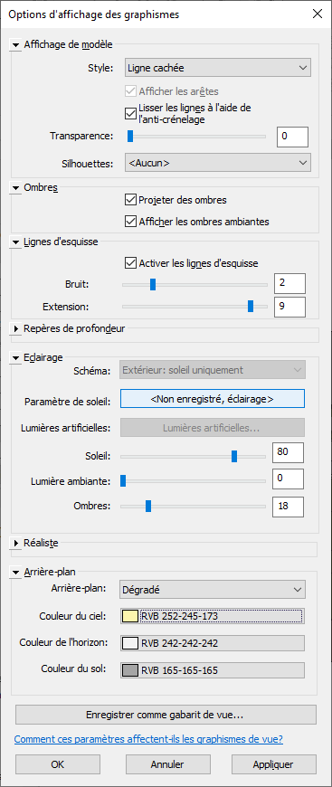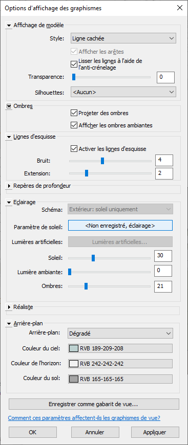 Cette vue utilise les paramètres suivants dans la boîte de dialogue Options d'affichage des graphismes :