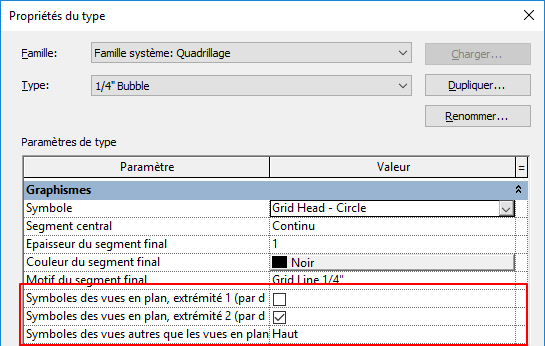 - Pour afficher les bulles de quadrillage au point de départ des lignes de quadrillage dans une vue en plan, sélectionnez Symboles des vues en plan, extrémité 1 (par défaut).