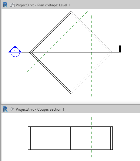 Par exemple, le plan d'étage suivant affiche deux plans de référence, indiqués par des pointillés verts. Le plan de référence de gauche croise la ligne de coupe selon un angle non droit. Le plan de référence de droite est perpendiculaire à la ligne de coupe. Comme le premier plan de référence n'est pas perpendiculaire à la ligne de coupe, le plan n'apparaît pas dans la vue en coupe obtenue. Par contre, le plan de référence perpendiculaire s'affiche dans la vue en coupe.
