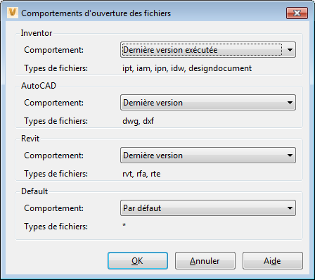 Déterminez si la dernière version, la dernière version exécutée ou la version de l'application de CAO dans laquelle le fichier a été enregistré est utilisée à l'ouverture des fichiers Inventor, AutoCAD et Revit.