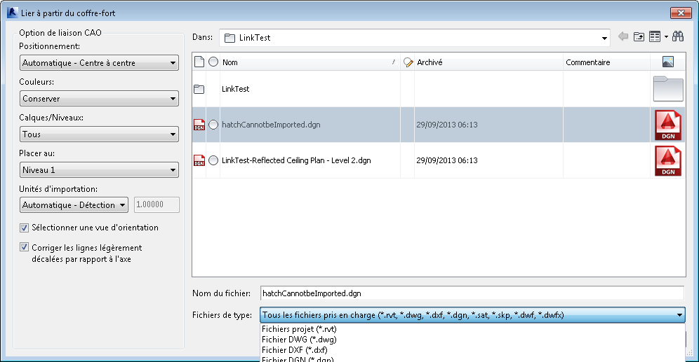 Vous pouvez sélectionner une préférence de positionnement lorsque vous liez un fichier au projet Revit en cours.