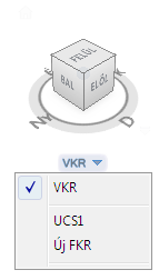 A ViewCube alatt található FKR menüben megjelenik a modellhez használt aktuális FKR neve. A menüből lehetőség van a modellel mentett, elnevezett FKR rendszerek valamelyikének visszaállítására, a VKR rendszerre történő váltásra, illetve új FKR létrehozására. A menü VKR elemével az aktuális FKR koordináta-rendszerről átválthat a VKR rendszerre. Az Új FKR menüparancs segítségével lehetősége van megadni új FKR rendszert az aktuális FKR egy, kettő vagy három pont alapján történő elforgatásával. Ha az Új FKR lehetőségre kattint, akkor Névtelen névvel létrejön egy új FKR. Az újonnan definiált FKR saját névvel történő mentéséhez használja az FKR parancs Elnevezett paraméterét.