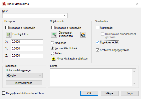 Megadja az új blokkba kerülő objektumokat és azt, hogy a kiválasztott objektumok megmaradjanak, törlésre kerüljenek vagy egy blokkpédánnyá konvertálódjanak a blokk létrehozása során.