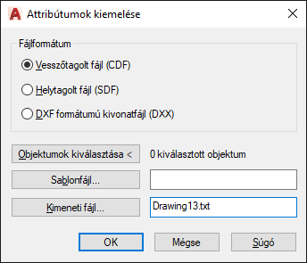 Az AutoCAD Drawing Interchange File (rajzcserefájl) formátum egy olyan változatát hozza létre, amely csak blokkreferenciát, attribútumot és sorozatvége objektumot tartalmaz. DXF ™ formátumú kiemeléshez nincs szükség sablonra. A kimeneti fájlt a normál DXF-fájloktól a .dxx fájlkiterjesztés különbözteti meg.