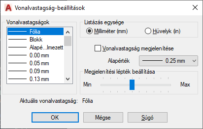 Beállítja az aktuális vonalvastagságot és vonalvastagság-egységeket, vezérli a vonalvastagságok megjelenítését és megjelenítési léptékét, valamint beállítja a fóliák ALAPÉRTELMEZETT vonalvastagság-értékeit.