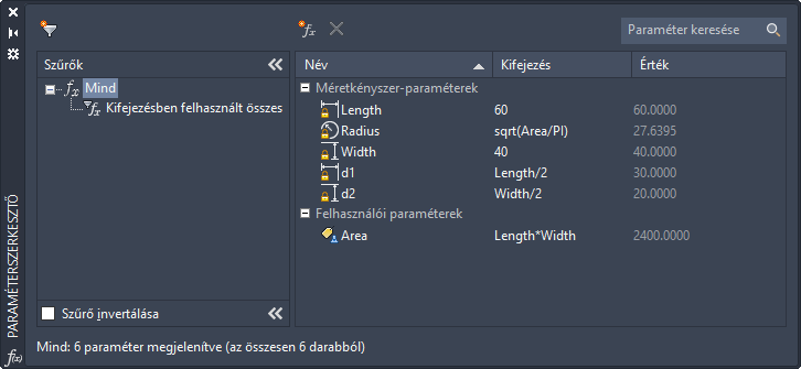 A hossz és a szélesség méretkényszer-paraméter értéke állandó. A d1 és a d2 kényszer egyszerű kifejezés, amely a hossz és a szélesség értékre hivatkozik. A sugár méretkényszer-paraméterhez megadott kifejezésben szerepel négyzetgyökvonási függvény, szerepel benne zárójel (a műveletek sorrendjének meghatározása érdekében), a terület felhasználói változó, az osztás műveleti jele, valamint a PI állandó. Ezen paraméterek mindegyike elérhető a Paraméterkezelőben.
