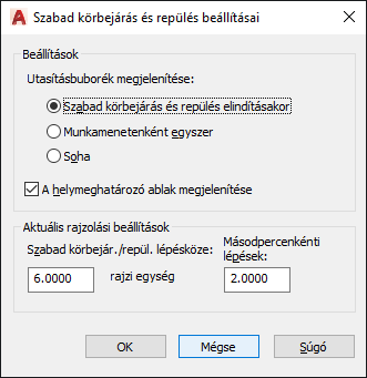 Megadja az aktuális rajzra érvényes szabad körbejárás és repülés mód beállításait.