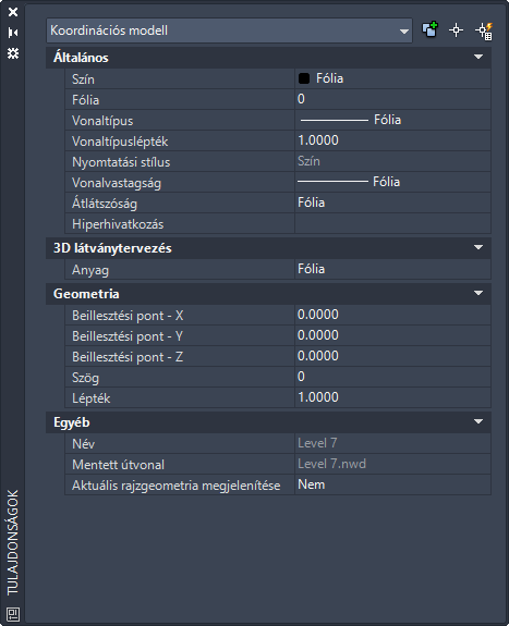 A Tulajdonságok paletta megjelenítéséhez kattintson duplán a koordinációs modellre vagy a modell körüli befoglaló téglatestre.