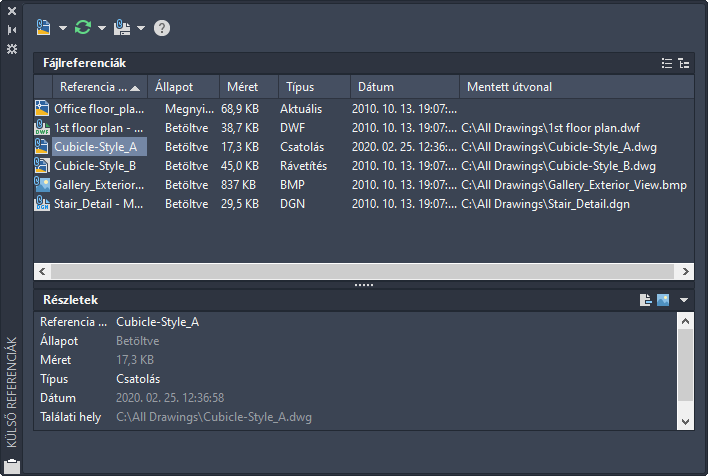 A Külső referenciák paletta rendszerezi, megjeleníti és kezeli a hivatkozott fájlokat, például a DWG-fájlokat (xrefeket), a DWF-, DWFx-, DGN- és PDF-alávetítéseket, a raszterképeket, a pontfelhőket (RCP- és RCS-fájlokat) és a koordinációs modelleket (NWD- és NWC-fájlokat).