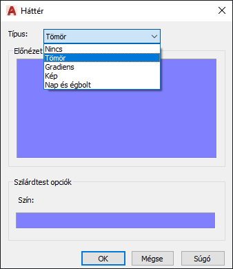 Felsorolja a nézetre alkalmazható háttér-felülírásokat (Nincs, Szilárdtest, Gradiens, Kép, Nap és égbolt).