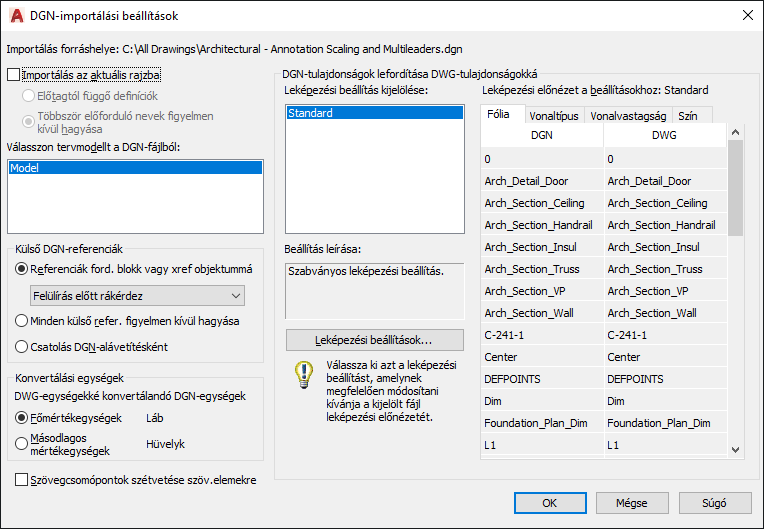 Az alapértelmezett leképezési beállítás a Standard, amely adatokat emel ki az éppen exportált rajzból, és a leképezési előnézetben látható módon automatikusan leképezi a DGN-fóliákat, a -vonalvastagságokat és a -színeket.