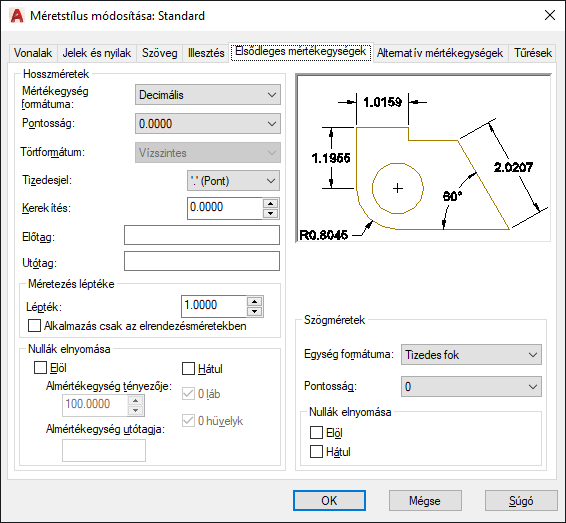 Az elsődleges mértékegységek formátumának és pontosságának beállítása, illetve elő- és utótagok hozzáadása a méretszövegekhez.