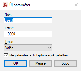 Az új paraméter típusát határozza meg. A választható paramétertípusok: valós, távolság, terület, térfogat, szög, karakterlánc.