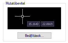 Ha a mutatóbevitel bekapcsolt állapota esetén egy parancs aktív, a szálkereszt helyzetének koordinátái megjelennek a mutatóhoz közeli eszköztipp beviteli mezőiben. Megadhatja a koordinátaértékeket az eszköztippben is a parancssor helyett.