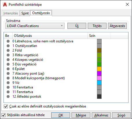 Az Intenzitás, a Szintmagasság és az Osztályozás stilizálások a pontfelhő érintett pontadatai alapján színezik a pontfelhőt. Kiválaszthat egy előre meghatározott színsémát, amilyen például a Spektrum vagy a Föld, illetve létrehozhat saját sémákat is. Hozzárendelheti ugyanazt a sémát az Intenzitáshoz és a Szintmagassághoz, vagy eltérő sémát is rendelhet hozzájuk. Az osztályozás külön sémakészlettel rendelkezik.