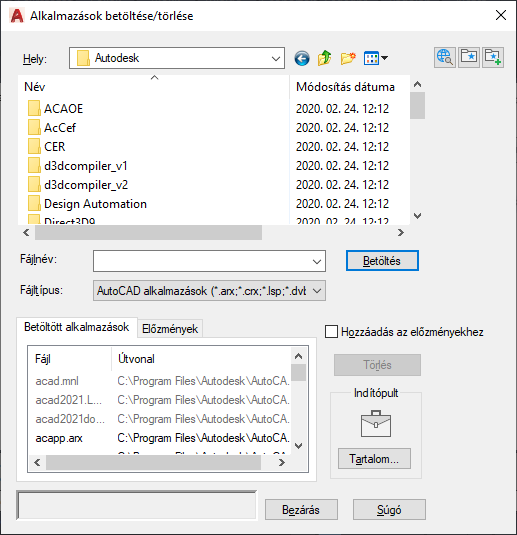 Ha korábban már betöltött fájlt jelöl ki, a Betöltés újra betölti az alkalmazást, ha ez lehetséges. ObjectARX-alkalmazások nem tölthetők be ismételten. Ilyenkor először el kell távolítania az ObjectARX-alkalmazást, majd újra be kell töltenie. A Betöltés opció helyi menüből is elérhető, ha a jobb gombbal egy fájlra kattint az Előzmények lapon.