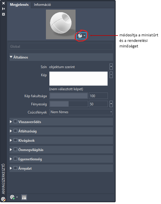 Szerkesszen egy meglévő anyagot (ami az Autodesk anyagtárban található), vagy kezdjen egy általános anyaggal. Az elvégzett változtatások megjelennek az anyag mintaképén. A megjelenített kép alakját módosíthatja az előnézetben.