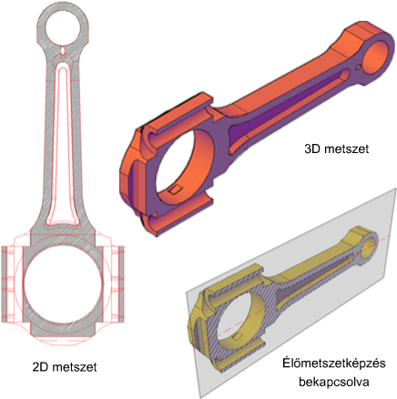 A 3D modell lemetszett részének közzétételéhez vagy rendereléséhez válassza a 3D metszet lehetőséget. A 3D metszetgeometria leginkább 3D szilárdtestekből és felületekből áll. Azonban a profil körvonala és a sraffozási minta 2D vonalakból áll.