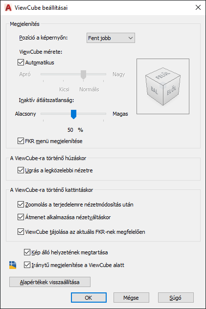Jelenítse meg a ViewCube beállításai párbeszédpanelt.