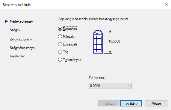 A Részletes beállítás varázsló öt lappal rendelkezik, ezek a Mértékegységek, Szögek, Zérus szögirány, Szögmérés iránya és Rajzterület. A varázslóban végzett munka során a Vissza és Tovább gombokra kattintva lehet az oldalak között váltani. Az utolsó lapon kattintson a Befejezés gombra a varázsló bezárásához és az új rajz létrehozásához a megadott beállításokkal.