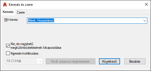 Megkeres minden parancsot vagy parancstulajdonságot írásmódjuktól függetlenül (például a parancs a VONAL és vonal parancsot is megtalálja).