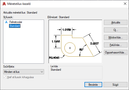 Megjeleníti az aktuális méretstílus nevét. Az alapértelmezett méretstílus a STANDARD. A program az aktuális stílust alkalmazza a létrehozott méretekhez.