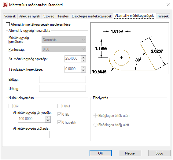 Meghatározza az alternatív mértékegységek megjelenítését a méretekben, és beállítja a formátumukat és pontosságukat.