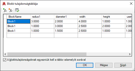 A Blokk tulajdonságtáblája párbeszédpanelen az oszlopok fejlécei a paramétereket jelölik, a sorok pedig a tulajdonságkészlet-értékeket adják meg. Beállíthat egy kijelölt blokkreferenciát a megadott értékekhez. Mindegyik blokkdefiníció csak egy táblát tartalmazhat.